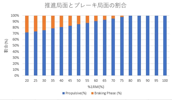 75%1RM負荷以下の重量では、ブレーキ局面が発生しており、