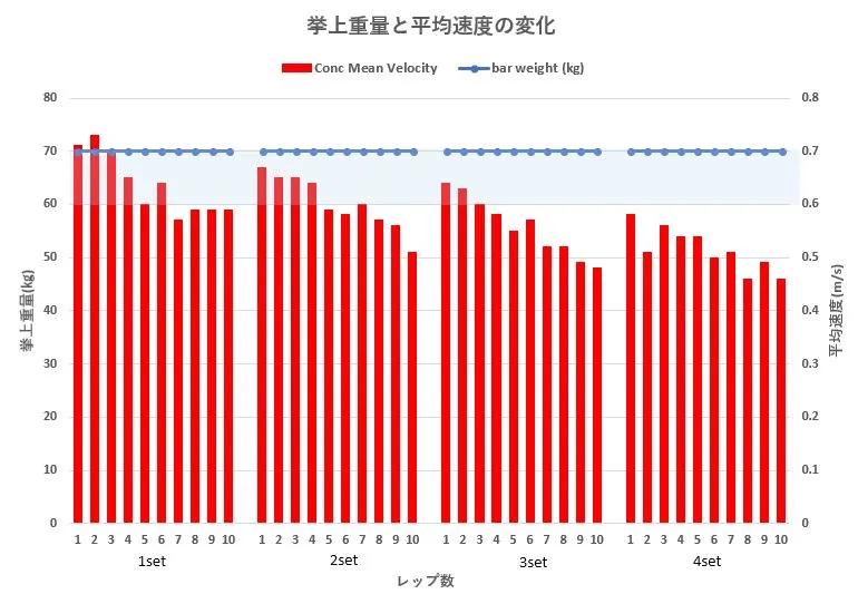 一つ目のグラフは挙上重量とコンセントリック局面における平均速度の変化を表したものです。