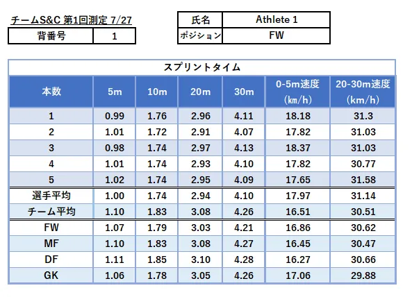 選手は自分の長所や短所に気づくことができ、例えば自分が5mや10mが速いとわかれば、プレー中に思い切ったプレーができるようになるかもしれません。指導者は長所を伸ばし、短所を克服するような具体的なトレーニング計画を立てることができます。