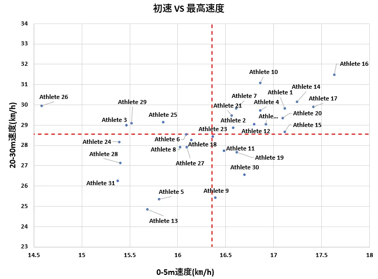 0-5m区間や0-10m区間の初速と20-30m区間の最高速度を散布図で表すと下記のようなグラフができます。真ん中の赤い点線はチーム内の平均値です。平均値で区切ることで、選手がチーム内でどのような特徴を持った選手か明確に確認できます。4分割されたうちの右上にいる選手は初速も最高速度も高い選手です。左上にいる選手は最高速度は高いが、初速が遅い傾向があり、初速を速くするためのトレーニングに重きを置くべきです。選手も自分の位置や課題が見つけやすい形式です。