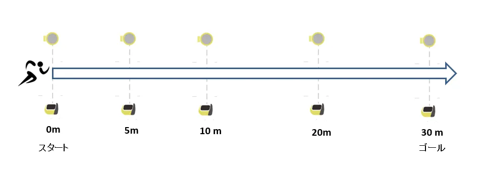 測定準備:各地点にマーカーを設置します。今回はラップタイムも計測できるようにスタート地点、5m、10m、20m、30m地点にマーカーを置き、タイム計測デバイスを設置します。ゴール後方、3~5m地点にも目印となるマーカーを設置します。(ゴール地点手前でスピードを緩めないようにするためです。)
