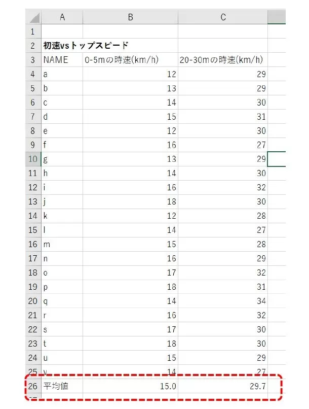 これはある大学サッカーチームで、0-5mまでの平均速度と20-30mの間の平均速度の例です。
