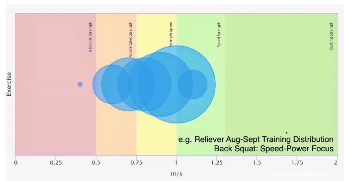 この例はあるリリーフ投手の8月~9月にかけてのバックスクワットの結果ですが、Strength SpeedとSpeed Strengthというゾーン付近に一番大きな円があり、スピードとパワーにフォーカスするという目的に合ったトレーニングができていることがわかります。