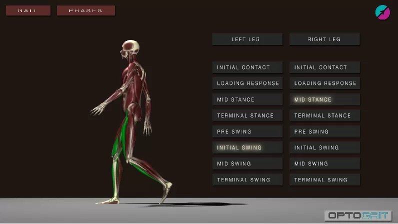 また、レポート上の問題点となる部分をクリックすると、映像で「歩行中の、どの筋が使われている、どのフェーズ」かが一目でわかるよう表示されます。