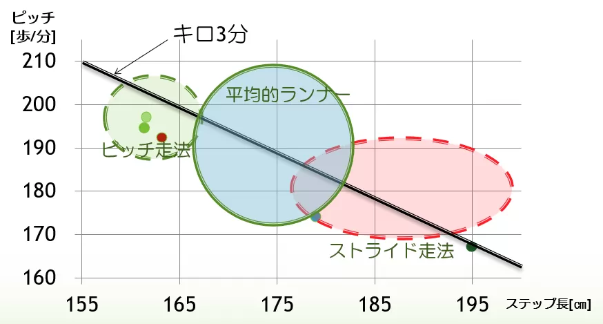 スピードが同じならグラフ上に示したラインが右肩上がりになることは絶対にありません。平均的か、ストライド走法かピッチ走法か、より極端なオーバーストライドかオーバーピッチか、となります。