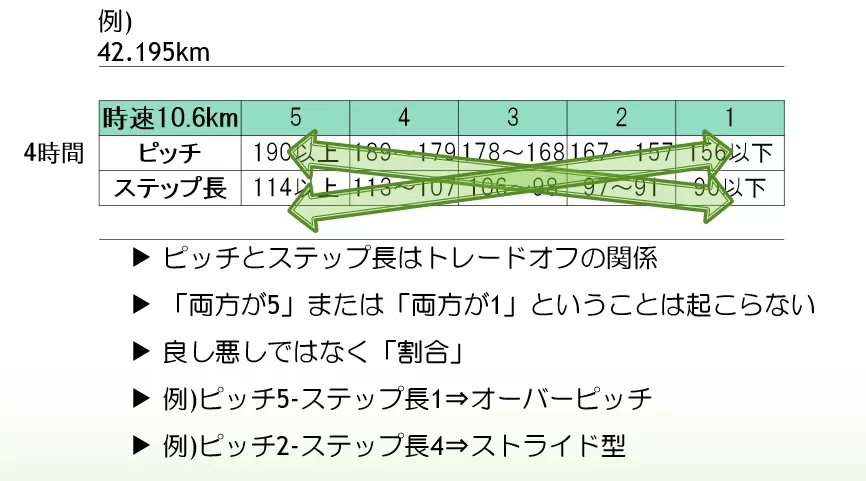 逆もあり得ます。極端なピッチ走法だということが分かった場合ピッチを少し抑えて、ステップ長をわずかに伸ばせば、それも楽に走れる可能性があります。