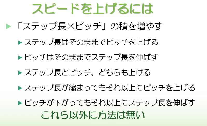 すでにお伝えしたように、ランニングスピードはステップ長×ピッチで決まります。
