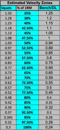 下の表は、私が作成したチャートです。この表を使えば、スクワットとベンチプレスまたはデッドリフトの%1RMに対応したスピードが一目でわかります。このスピードになる重さを見つけてトレーニングすればよく、セット内でこの速度以下になったらセットを終了すればよいのです。