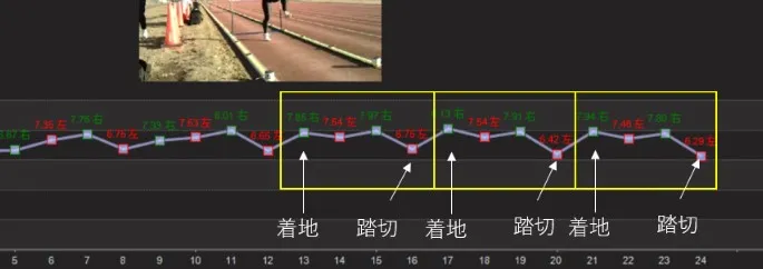 着地足の次の歩数(左足)でスピードが低下しているので、それをできるだけ抑えて速度を維持するということが課題だとわかりました。