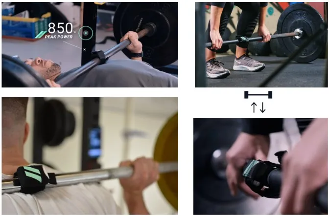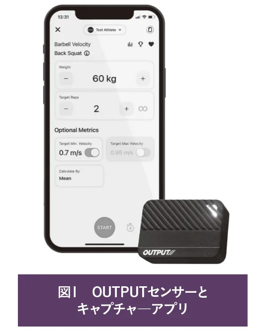 OUTPUTのセンサーは、ホッチキス針の箱くらいの大きさで重さはわずか21g。3軸加速度計、3軸ジャイロスコープ、3軸地磁気計を内蔵し、最大サンプリング周波数500Hzで8時間連続使用が可能な充電式バッテリーで稼働します。 この小さなセンサー1台だけで、異なるカテゴリーの測定が可能です。測定する種目やテストに応じて、長さや形状の異なる5種類のストラップで、バーベルや身体各部に装着し、OUTPUTキャプチャーと呼ばれるアプリ(iOSとアンドロイドに対応)でデータを取得します(図1)。