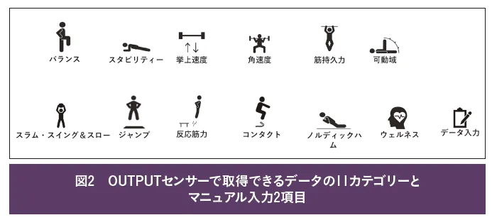 OUTPUTでデータ取得できるパフォーマンスとトレーニングとリハビリテーションのための測定カテゴリーには以下の11種類があり、後述するマニュアル入力のカテゴリーが2項目あります(図2)。