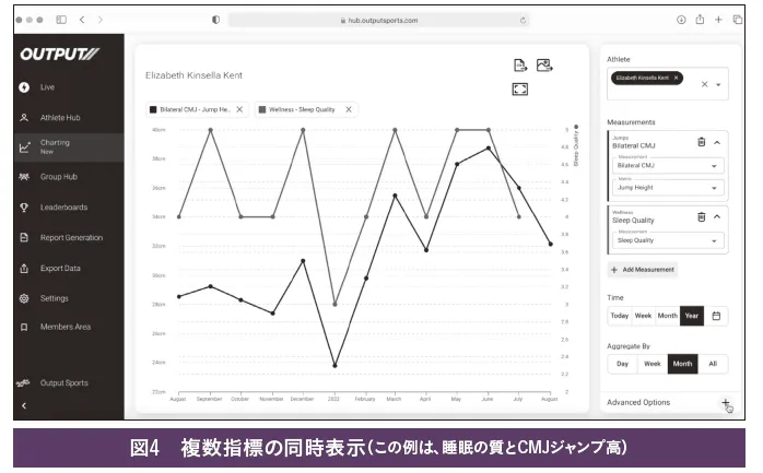 センサーとキャプチャーアプリで取得したパフォーマンスやトレーニングやリハビリテーションのデータを効率よく分析し、変化の傾向を追跡し、さまざまな判断や意志決定に役立てるためには、Hubと呼ばれるアスリートの人数に応じたサブスクリプション方式のデスクトップ用ソフトウエアを使用する必要があります。OUTPUTはこのHubなしにキャプチャーアプリを使用することができません。しかし、Hubによって、サードパーティのアスリート管理ソフトやエクセル等を介さずに、登録したアスリートのコンディションを様々なグラフやテーブルによって一目でチェックすることができます。1つのグラフに複数の異なる指標を同時に表示させることができますから、単一の指標だけでは見えないより多角的な視点からの判断も可能となります(図4)。