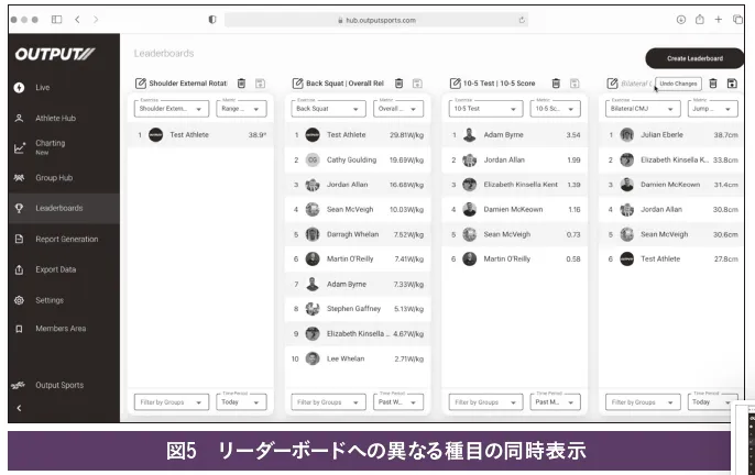 トレーニングや測定において選手のやる気を喚起することは、多くのトレーニング指導者の望むところです。ライブでのリーダーボードによって、競争的な雰囲気を作り出し、最大努力する意識を高く維持させることができることはよく知られています。Hubのリーダーボードは最大で4つ作成することができます。異なるランキングや比較のための基準や指標を用意することで、自分自身をより冷静に見つめ、より高いモチベーションを引き出すことが可能となります(図5)。