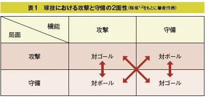 侵入型スポーツにおける攻撃と守備について戦術理論の観点から整理されたものに、稲垣による攻撃と守備(防御)における機能の2面性という理論があります1,2)。侵入型スポーツにおいてはボールを保持しているチームまたは選手が攻撃、ボールを保持していないチームまたは選手は守備という局面にいることになりますが、この攻撃と守備という局面には、それぞれ攻撃機能と守備機能という2つの機能を併せ持つというのが、攻撃と守備の2面性理論です。この理論を私なりにまとめたのが表1です。