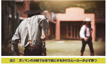 これは、西部劇の決闘シーンで、悪役が先に銃に手を掛けるにもかかわらず、後から銃を取ったヒーローが必ず勝つということに興味を持ったノーベル賞物理学者ニールス・ボーアの着想にヒントを得て行われたいくつかの実験で、自発的な運動よりも刺激に対して反応した運動のほうがその遂行時間が短くなる、ということが確かめられ名付けられた法則です。