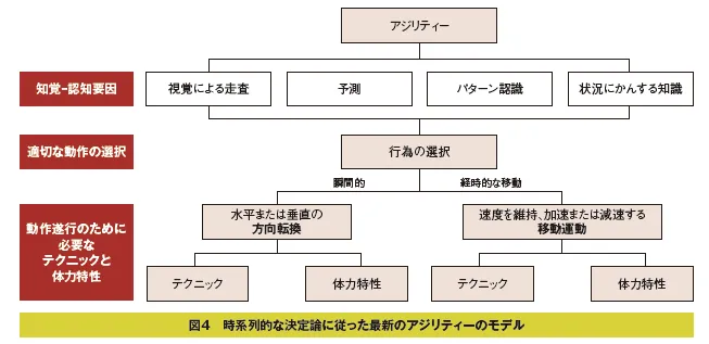 また、2022年に示されたモデル10)は以前のような構成要素の並列的な構造ではなく、図4のように、外界の知覚から意思決定そして動作の遂行という時間の経過に伴って前の要因が後の要因に影響するという要因間の決定論的関係とその内容によって構造化されており、アジリティーの本質をより的確に理解できるものとなっています11)。