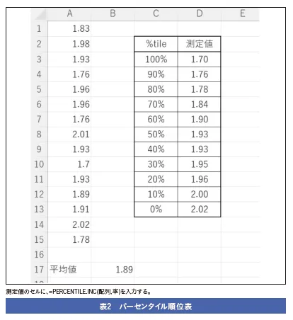 先ほどのデータテーブルの横に、100%から0%までのそれぞれのパーセンタイル値に対応した測定値を表示させる表を用意しておきます。そして100%、すなわち最高値を表示させたいセルに、=PERCENTILE.INC(と入力し、データの配列を選択します。さらに、カンマの後ろに、0と入力してカッコを閉じてエンターを押します。すると、1.70、つまりこのデータの中の最も小さな値が表示されます。