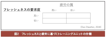ピリオダイゼーションとは、「トレーニングの計画と組み立て」ということをお洒落に言い換えただけだ、というダン・クレザーは、トレーニング計画を立案するうえでその最も重要な検討事項となるのは週間構造であるとしています。そして、「フレッシュネス」と「疲労」という2つの視点からトレーニングセッションをカテゴリー化する有効性を示しています。フレッシュネスとはそのトレーニングをするにあたって選手が疲労していないフレッシュな状態にあること、疲労とはそのトレーニングによる選手の疲労レベルを意味します。この2つの視点から、図2に示したような4象限のトレーニングユニットが分類されています。