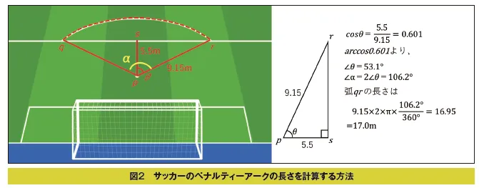 ペナルティーマークからペナルティエリアの端までの直線距離は5.5mなので、図の右側の式に示したように、三角形prsは、∠θの直角三角形となります。斜辺と隣辺の長さがわかっているので、三角関数cosθを求めると0.601となり、ここから逆三角関数arccosθを求めると∠θは53.1°であることがわかります。∠αはこの2倍ですから、半径9.15mの円周に対する中心角αの弧の長さは16.9m≒17mだということになります。