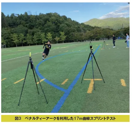 このように、公式ピッチのペナルティーアークの曲線が17mであることが明確ですので、弧のスタート地点とゴール地点に光電管を設置すれば17mの曲線スプリントタイムをいつでも簡単に計測することができます(図3)。