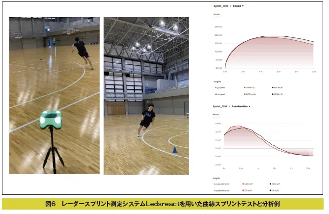 図6は、レーダーテクノロジーを用いた最新のスプリントスピード計測システムLedsreact(レッズリアクト)を用いて実施したバスケットボールの3ポイントライン上での曲線スプリントテストの様子とその分析例です。Ledsreactは選手にレーダーを照射することによって身体全体を追跡しタイムやスピードを計測します。距離を測って光電管を何台も設置しなくても、写真のように、本体1台だけで40mまでのスプリントやアジリティー運動を区間のタイムや平均スピードだけではなく、移動運動の連続的なスピードの変化を捉えグラフ化します。この例では、バスケットボールの曲線スプリントで頻出する距離のうち最も長い10mスプリントテストを行いました。