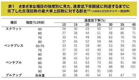 速度低下率の違いによってトレーニング効果が異なるという研究結果がある一方で、そうとは限らないという研究もあります。1.2m·s -1の速度が出るウェイトを担いでのカウンタームーブメントジャンプを、セッションのトータルが36レップになるように週2回セッションで8週間実施したトレーニングで、セット内の速度低下閾値を10%としたグループと20%としたグループで比較した研究13)では、パワーやジャンプ高やスプリントタイムのトレーニング効果においてグループ間で有意な差が見られませんでした。その理由として実際のセット内のレップ数には大きな個人差があったことが示されています(変動係数で約30%)。 また、複数の研究結果3, 12, 14, 15)を基にまとめられているデータ16)によれば、エクササイズ種目によっても、また強度(%1RM)によっても速度低下率と%総レップ数の関係は異なることが明らかにされています(表1)。