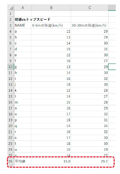まずこのように、氏名、0-5m、20-30mそれぞれの時速を入力します。