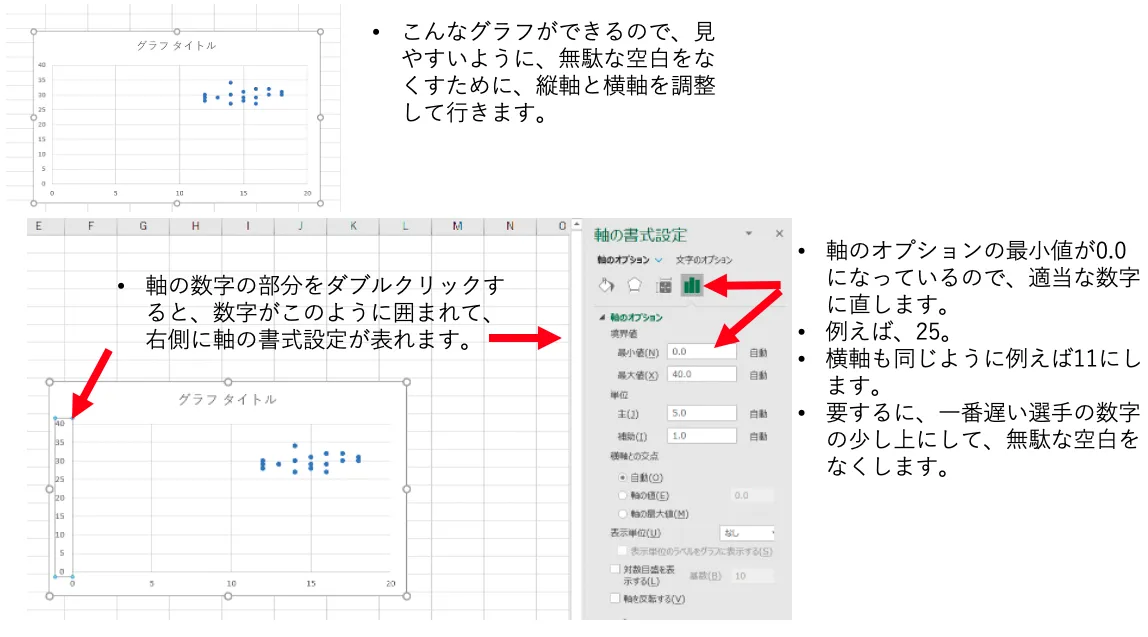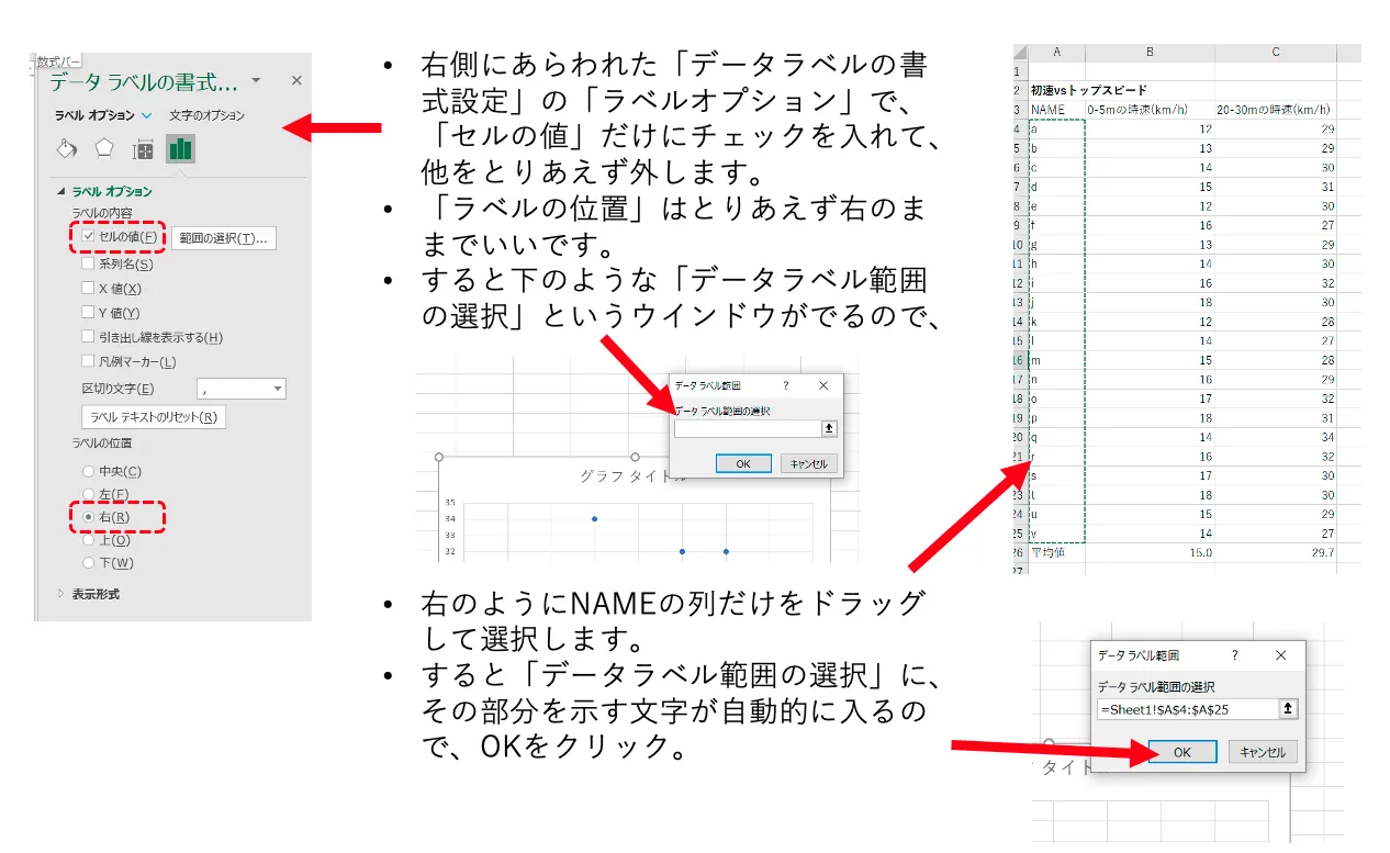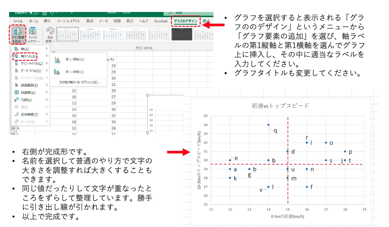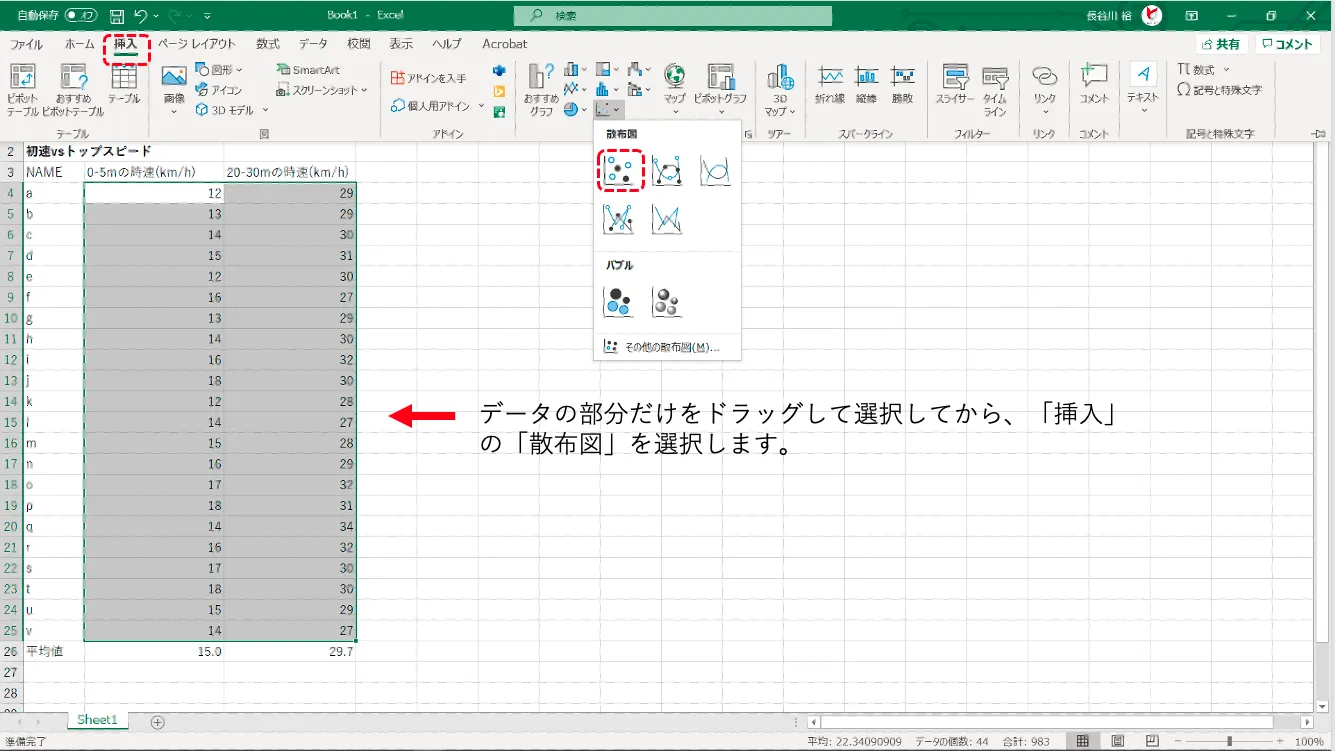 これはある大学サッカーチームで、0-5mまでの平均速度と20-30mの間の平均速度の例です。ここでは、こういうグラフの作り方を説明します。Office 365®の最新Excel®(バージョン2020)を用いた方法ですので、その他のバージョンのExcelでは少し違う箇所があります。類似したメニューや設定を見つけて試してください。