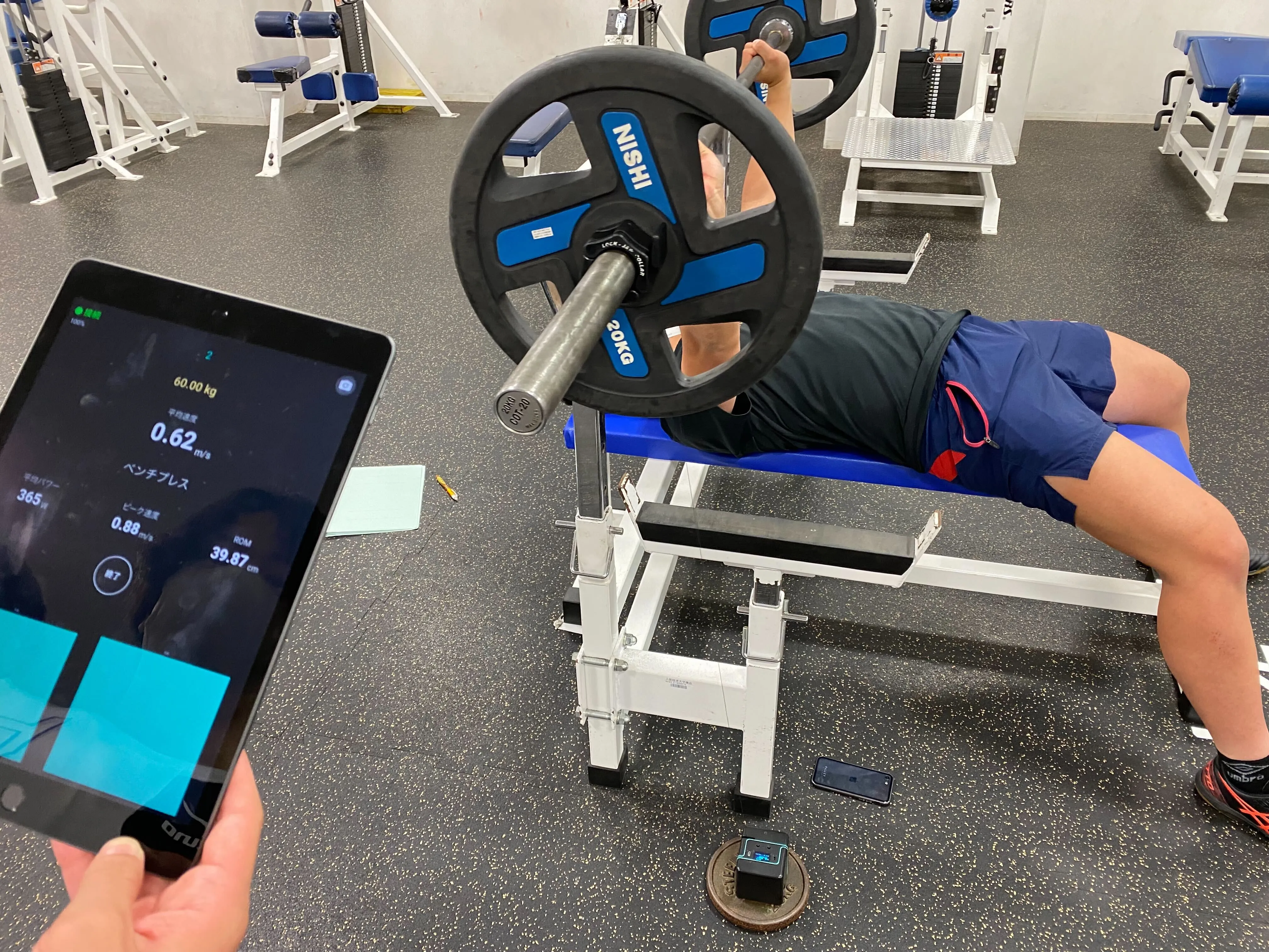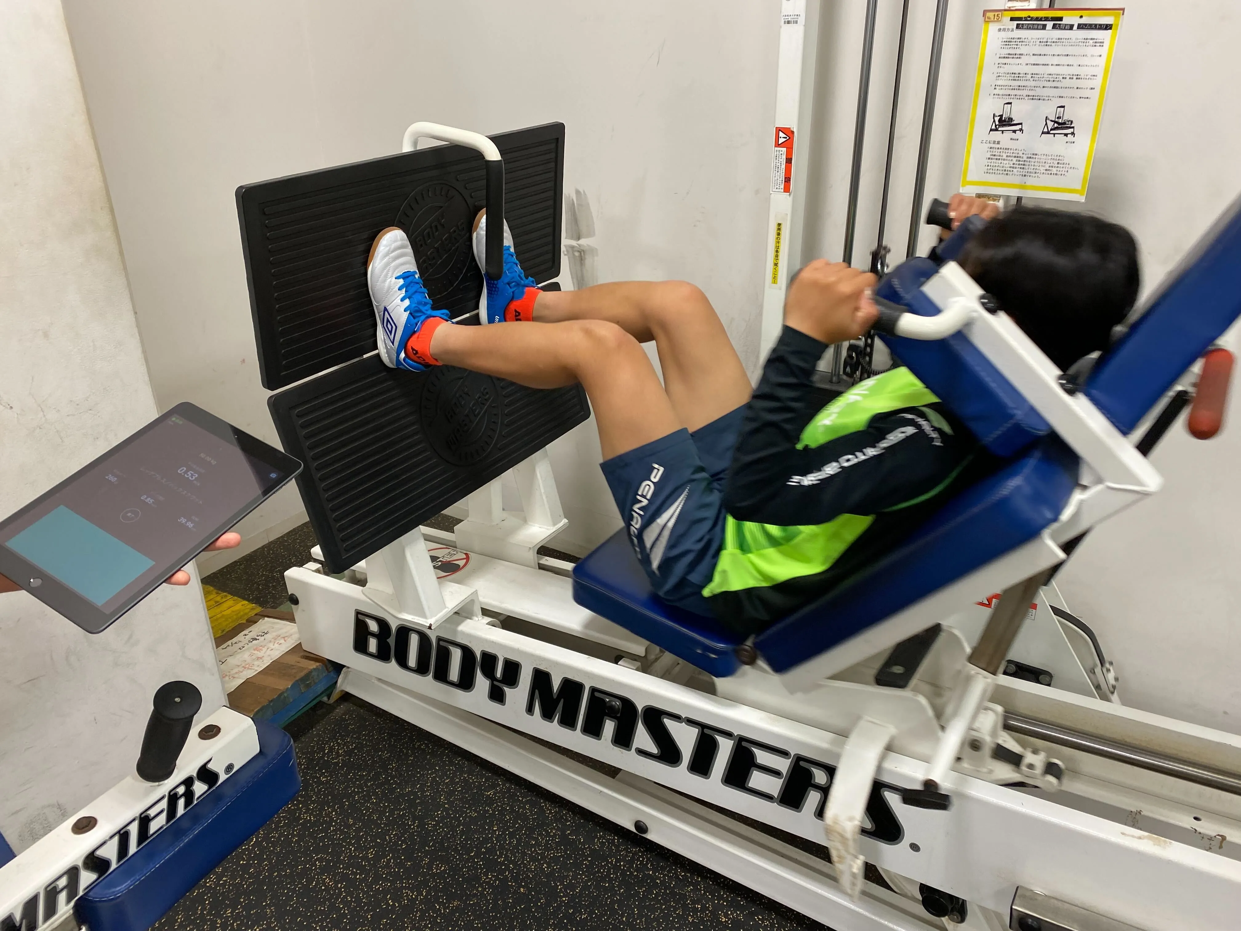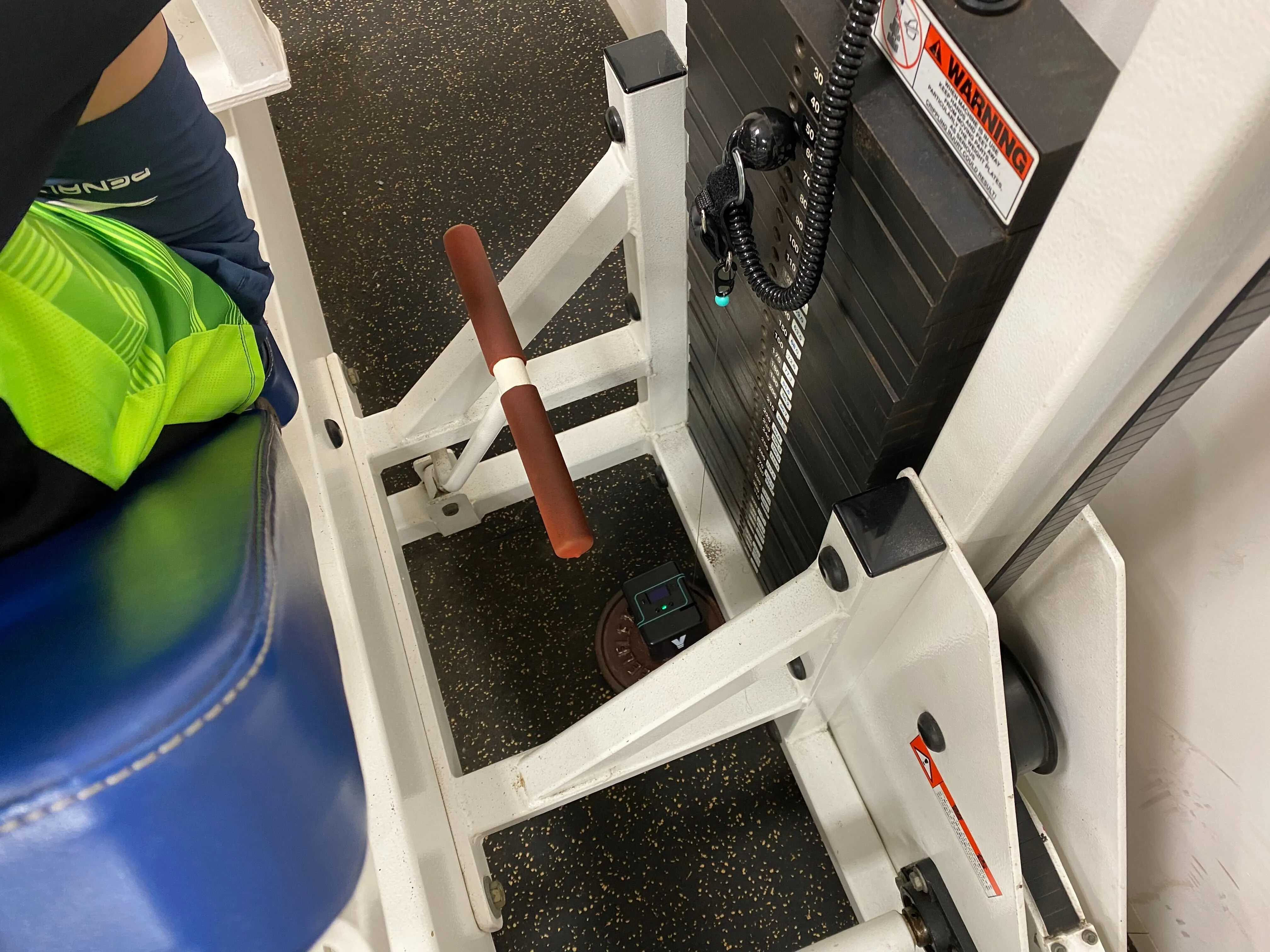 レッグプレスマシンなどのマシンも、ウエイトスタックのピンにストラップを固定することによって速度を計測しました。